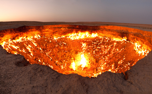 Craterul de gaze Darvaza, sau "Porţile Iadului", cum este numit de localnici, măsoară în jur de 70 de metri în diametru şi arde în continuu din anul 1971. După apusul soarelui, lumina sa poate fi vizibilă de la kilometri depărtare.
